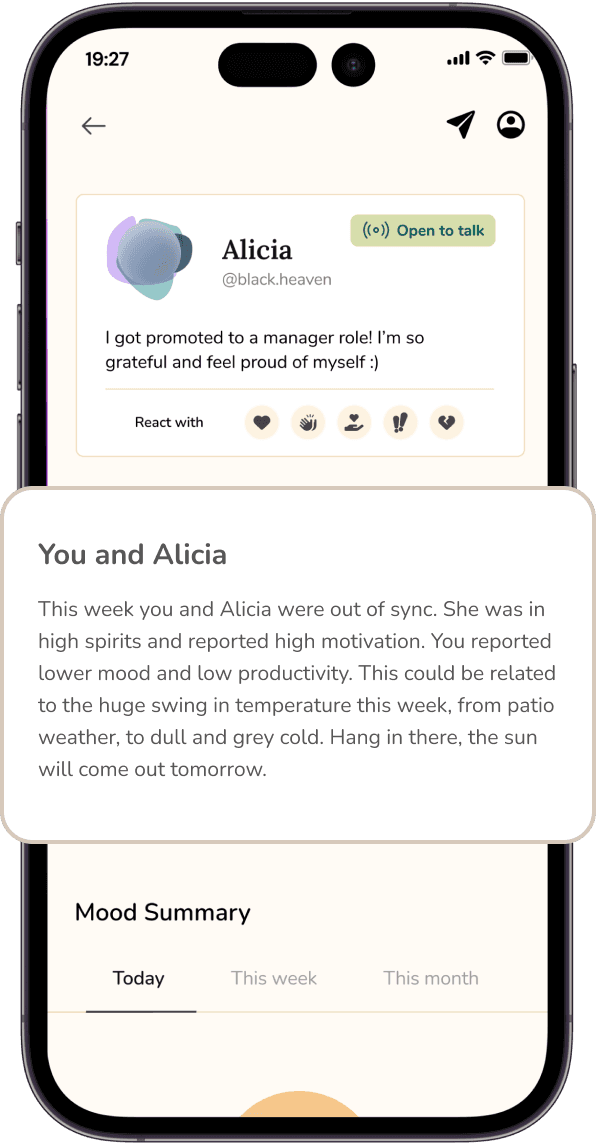 Explore shared insights with your friends and family, derived from each other's mood and passive data using AI.